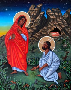 In this beautiful icon from artist Kelly Latimore, we see Mary Magdalene, one of Jesus’ most devoted disciples, who has been weeping outside of his empty tomb. After being asked by angels why she weeps, she sees a man she believes is a gardener. Poor grieving Mary doesn’t recognize Jesus at first, until he speaks her name.